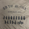 米軍払い下げの90年〜近年までのUSED PFU Tシャツに一枚一枚ステンシルペイントが施された一枚。正面に、第59 アルファ ボンバースコードロンの敵機撃墜を祝すデザインと、背面には架空のミリタリーSPECラベルのデザインがペイントされている。