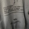 アメリカブランドのPULL OVER SWEAT PARKAのボディを使用しています。正面に、架空のミリタリーSPECラベルのデザインにポケット部分にアルファロゴとRE:SUPPLY、背面には第59 アルファ ボンバースコードロンの敵機撃墜を祝すデザインがペイントされている。