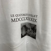 1789年 7月 14日は、バスティーユ監獄が襲撃されフランス革命の口火が切られた日として知られ、英語ではバスティーユ・ ディとも呼ばれます。T シャツ前面には煙の上がるバスティー ユがモザイクに。バックにはそのヒントのように 7月 14日がフランス語で LE QUATORZE JUILLET、1789年をローマ数字で表 す MDCCLXXXIX の文字が記されています。