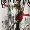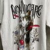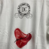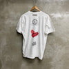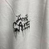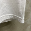 古着のような少しやれ感がある白ボディーに、洗練された日本のサブカルチャーを連想させるようなグラフィックがデザインされた一着。オーバーサイズでの着こなしが、独特のシルエットを生み出します。バックのネック部分のブランドタグは、糸で縫い付けられていますが外すことが可能です。
