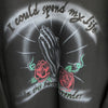 高級感のあるボディーにエアブラシの様な技法で、神に祈りを捧げるデザインが描かれた1着。裏起毛で温かく、生地にも重厚感があります。