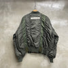 定番化されつつあるKURO のリメイクシリーズの縦のラインを生かした切り替えは、色を同色系に統一しトーンを抑えています。螺旋階段のイメージで裾が段々になるよう計算して組み合わせられており、ビックサイズに変化したMA-1 は建築的要素をふまえ前衛的な表情に変化しました。
