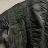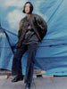 定番化されつつあるKURO のリメイクシリーズの縦のラインを生かした切り替えは、色を同色系に統一しトーンを抑えています。螺旋階段のイメージで裾が段々になるよう計算して組み合わせられており、ビックサイズに変化したMA-1 は建築的要素をふまえ前衛的な表情に変化しました。