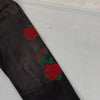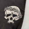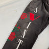 日本の加工技術を駆使し、洗い汚しによるビンテージ加工を施し、なんども着倒した風合いを演出したスウェットパンツ。左右随所に薔薇のプリント。左足部分には茨の冠を纏ったスカルとブランドのロゴプリントを落とし込んだ1点。