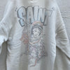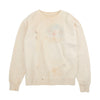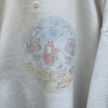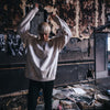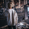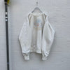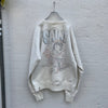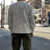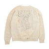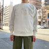 日本の加工技術を駆使し、洗い汚しによるビンテージ加工を施しなんども着倒した風合いを演出したスェットシャツ。バックプリントのユーモラスな聖人のグラフィティが象徴的な一枚。正面の胸部にも小さめなプリントが配置される。