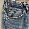 フ リーランスデザイナーとして活躍する管野寿哉氏。 管野氏が愛してやまないデニムスタイルの中でも最 も好きなブーツカットを採用し、今回のためにオリジ ナルのパターンを作成。 シルエットはストレートの膝をつまみ、裾幅を若干広 げることによってフレア感を軽減し、スニーカーにも 革靴にもマッチするスリムフィットブーツカットに仕上 げています。 素材にはコットン99%、ポリウレタン1%の12.5ozデニ ムを使用することで、ウエスト、ヒップ、膝周りにスト レスを与えない微ストレッチ感が特徴です。 こちらは、個性ある色落ちのデニムを普段から愛用 している管野氏らしい、ヴィンテージデニムを再現し た迫力のある風合いに仕上がっています。 フロントトップにはヴィンテージをオマージュしたオリ ジナルの鉄製タック釦を使用して天然錆を表現。 ベルト裏にはWESTOVERALLSの特徴でもあるブラ ンドオリジナルのゴムとサスペンダーループが付き ます。 縫製糸にはカタンと呼ばれる綿100%の糸を使用し ているので穿き込む毎に糸にも経年変化が楽しめ ます。 また綿糸なので強度が懸念されますが、糸切れな ども味わいと考えておりますのでご了承願います。 フロント右ポケット袋布裏にはオリジナルスタンプ、 バック右ポケットにはオリジナルシール、バンダナが 付属します。
